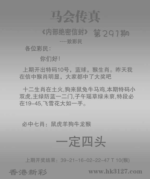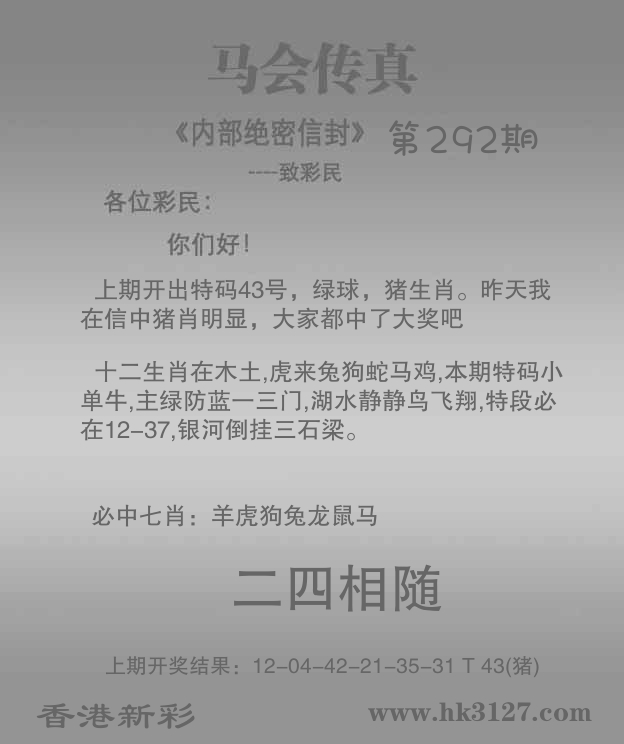 | 291期: ⑥肖 | 鸡牛狗鼠猪蛇 | 猪43中 |
