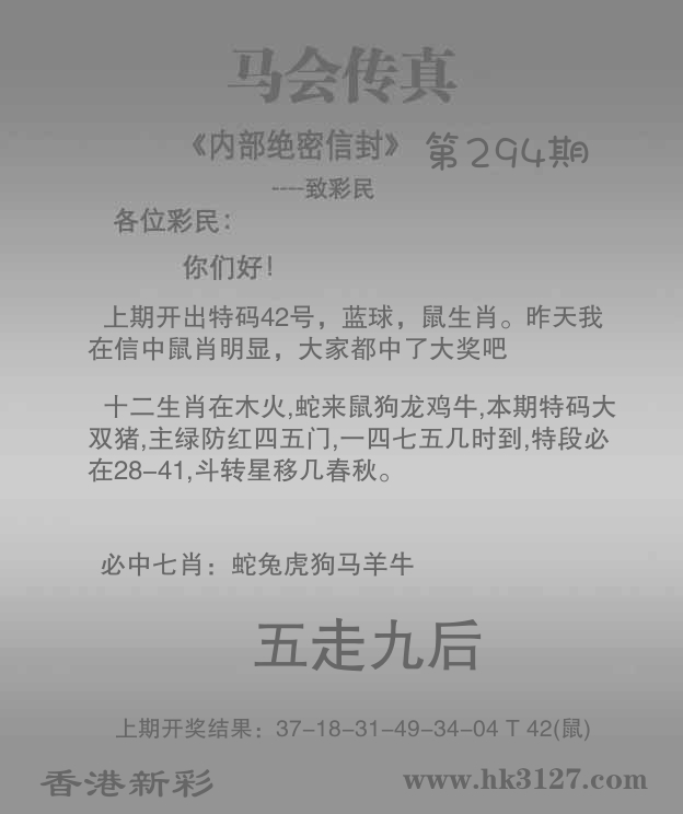 | 294期: ⑦肖 | 鸡狗羊兔牛蛇马 | 猴46中 |